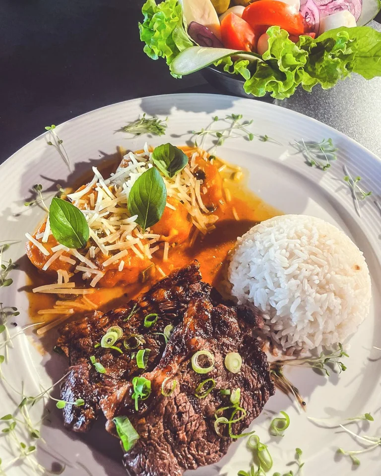 Acompanha filé grelhado, arroz branco e salada. Serve 01 pessoa.